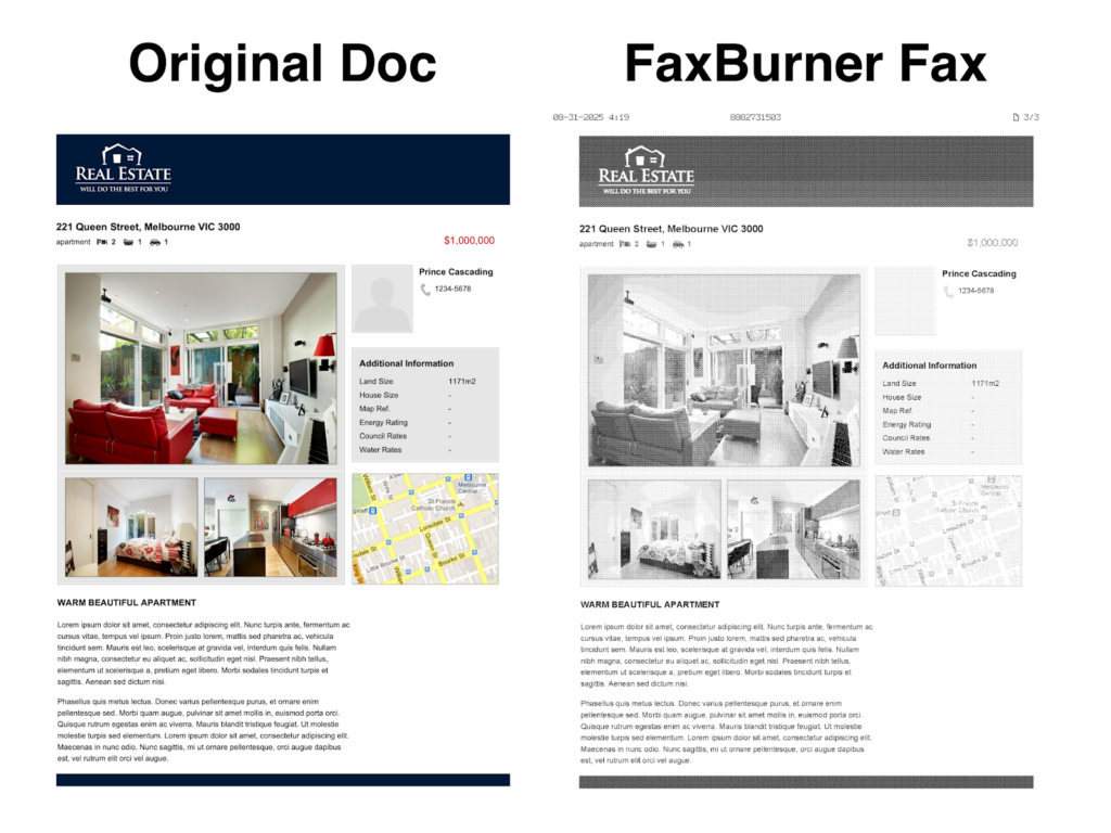 FaxBurner’s fax quality is average at best – operating at an industry-standard 204×196 dpi resolution, it will give you good quality text documents like letters and forms, but don’t expect detailed pictures or images to transmit perfectly – our test had a few lost details in the images (you can see this in the map and person icon in our test), and we saw color and shading not quite transmitting as well as other apps.