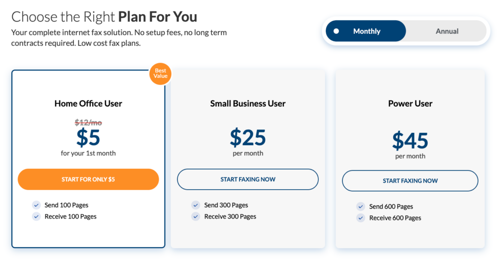FaxBurner’s price is unique on this list, in that it offers the best free option here. Without paying anything, you can send 5 fax pages per month every month, and receive 25 pages – using the app or email-to-fax. However, you cannot get your own permanent fax number until you sign up to a plan – the cheapest of which is $14.95 a month, giving you 500 pages each way every month – one of the cheaper options on this list.